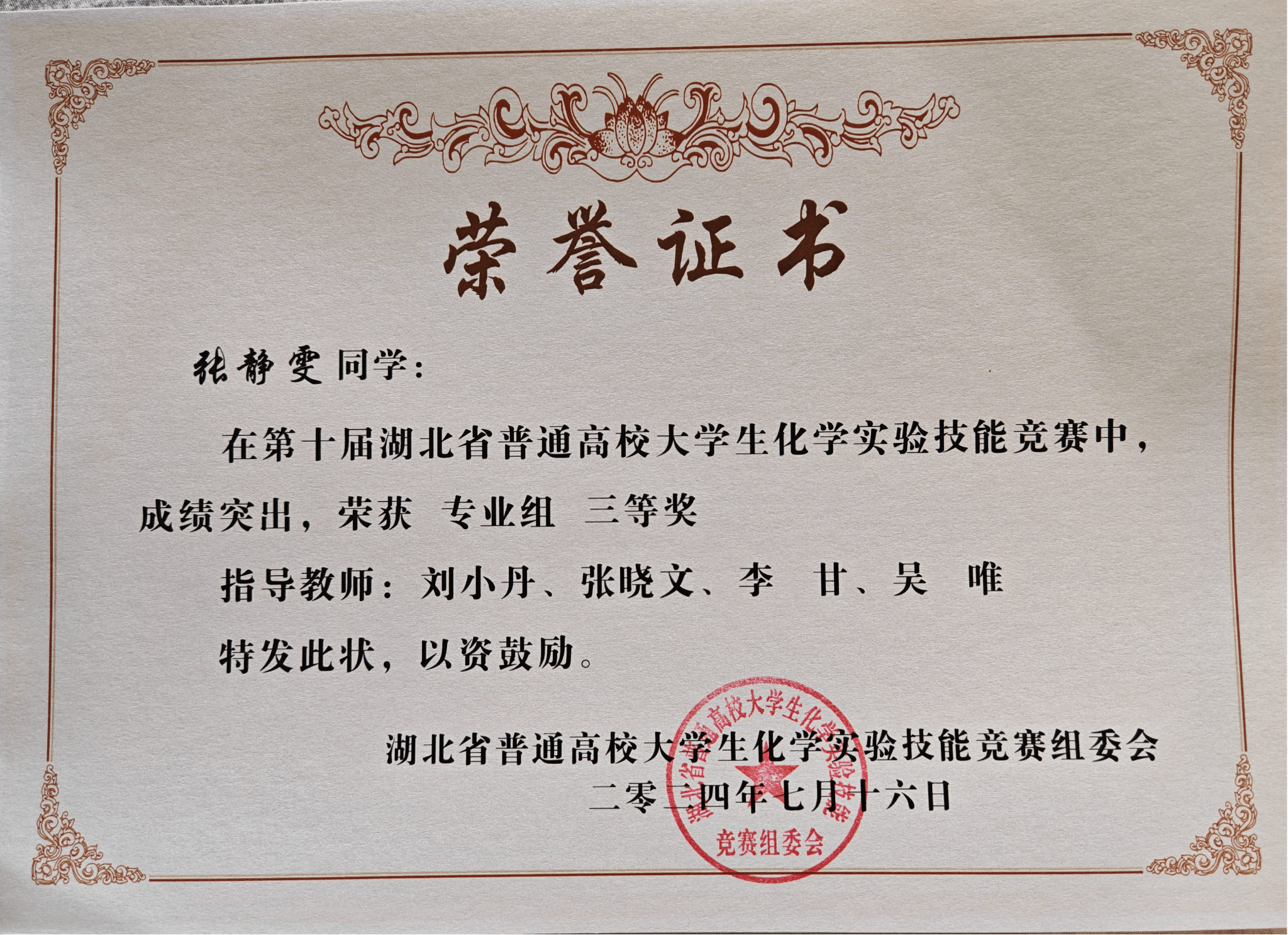 本网讯 2024年7月14日到16日,第十届湖北省大学生化学实验技能竞赛决赛在华中农业大学化学学院举行,Beat365生物化学系学子张静雯获得专业组三等奖。