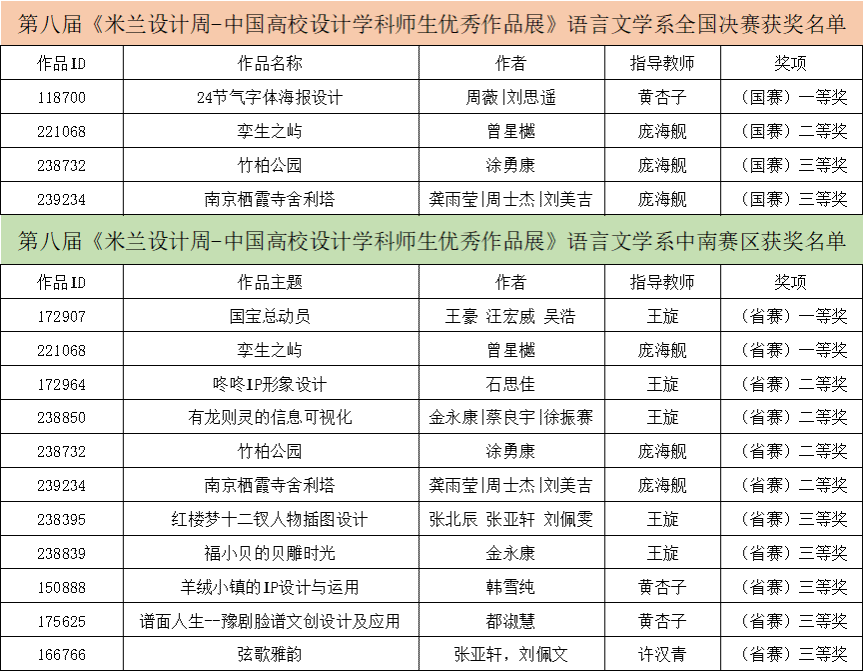 本网讯 近日,2024第八届米兰设计周——中国高校设计学科师生优秀作品展全国决赛落下帷幕,Beat365语言文学系视觉传达设计、环境设计专业学子取得了全国决赛一等奖1项、二等奖1项、三等奖2项的优异成绩。此前,在本届赛事中南赛区的评比上,语言文学系学子获得一等奖2项,二等奖4项,三等奖5项。