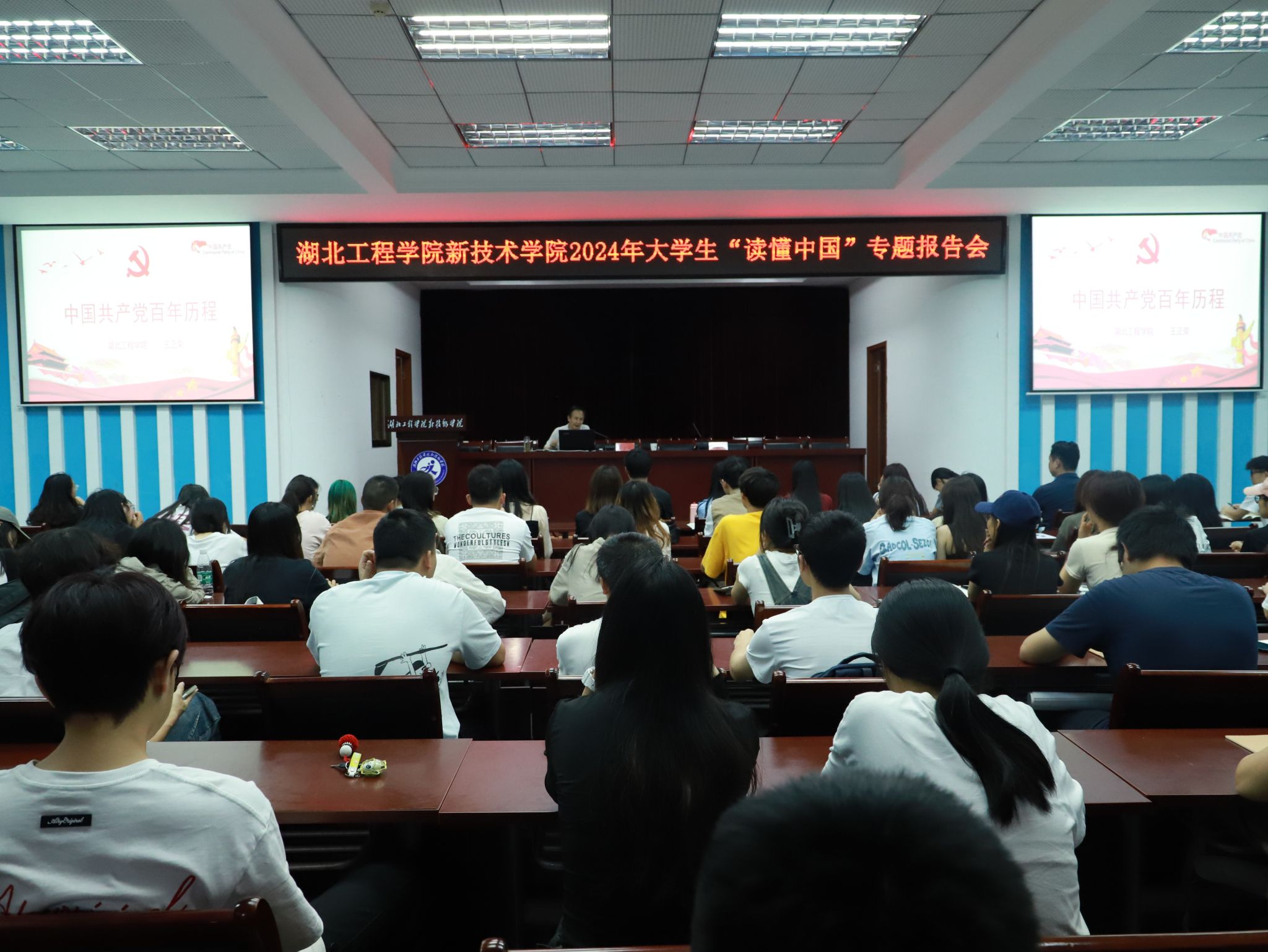 王正荣老师以“中国共产党百年奋斗史”为题,回顾了新中国成立前28年党的光辉历程,重点讲解了我们党在新民主主义革命时期、社会主义革命和建设时期的历史。沿着重要历史事件时间轴,在全球大历史观下,清晰详细地讲解了党的艰苦奋斗史。“红色政权来之不易,新中国来之不易”。同时,还穿插讲述了孙中山、毛泽东、周恩来等革命伟人的事迹,最早系统传播马克思主义的先驱“南陈北李”的故事,并分享了自身在部队的工作经历。王正荣老师指出,沉睡的雄狮已经苏醒,同学们生在好时代要不负好时光,应勤奋学习、锤炼身心、练就本领,成为能担当责任与使命的栋梁之材。