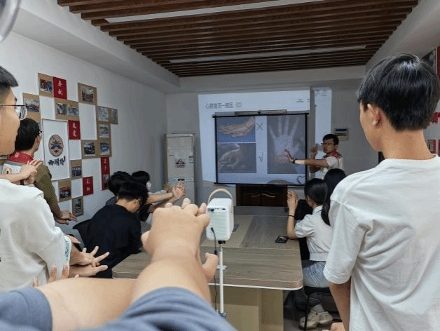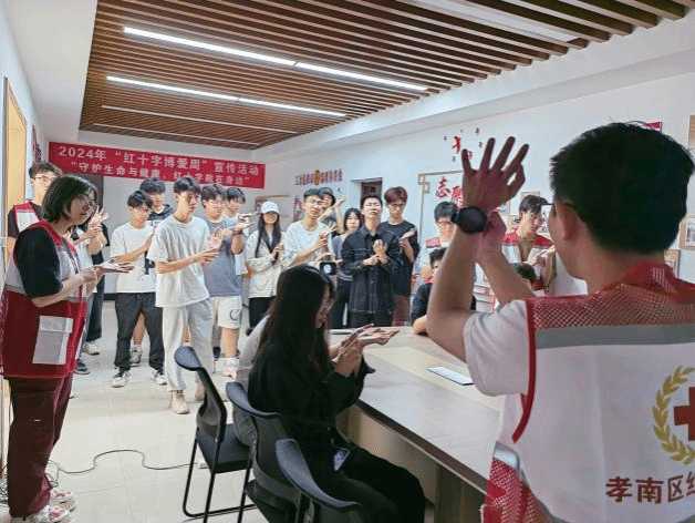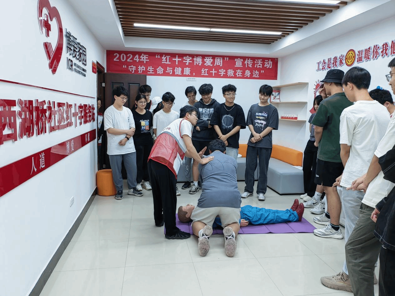活动开始前,志愿者及学生代表们在西湖桥社区工作人员的引导下了解了红十字会的发展历程和主要内容。随后,在书院社区卫生服务中心邓鹏医生的指导下,学习了心脏骤停的原因和急救措施:首先要判断患者的动脉跳动和呼吸情况,若确认为心脏骤停,则进行胸外按压和人工呼吸(按比例30:2)。志愿者们认真聆听医护人员的讲解,随后在实践中不断完善动作,提高急救能力。