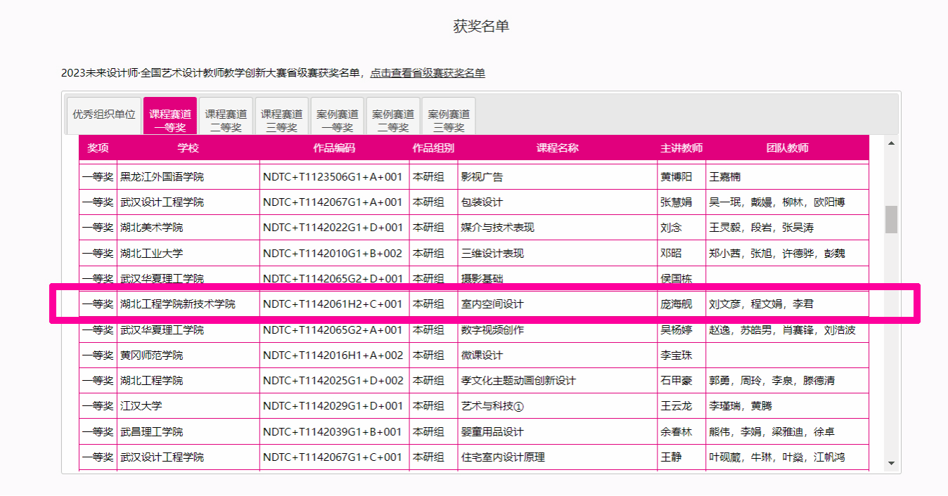 本网讯 近日,2023未来设计师•全国艺术设计教师教学创新大赛湖北赛区评比结果公布,语言文学系教师庞海舰的《室内空间设计》在本次大赛中荣获省赛一等奖,晋级国赛。