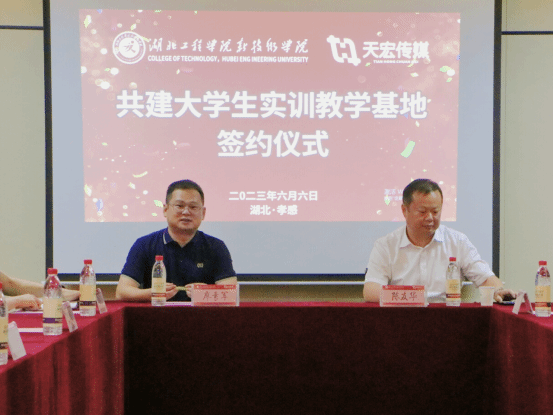 本网讯 6月6日下午,副院长陈友华,教务处、财经政法系和语言文学系相关负责人赴湖北省天宏文化传媒有限公司签订大学生实践教学基地协议并授牌。湖北省天宏文化传媒有限公司总经理廖素军、副总经理潘文豪、潘文博等出席了签约仪式。