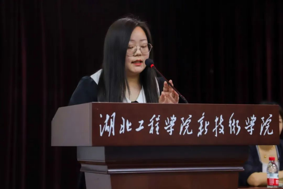 湖北米开罗那机电技术有限公司代表曹小梅女士讲话。她对持续关注和支持湖北米开罗那机电技术有限公司的学校领导和老师们表示感谢,并对获奖的同学表示热烈的祝贺。曹小梅女士介绍了公司的经营模式和发展现状,并表示公司将继续关注学校人才培养工作。