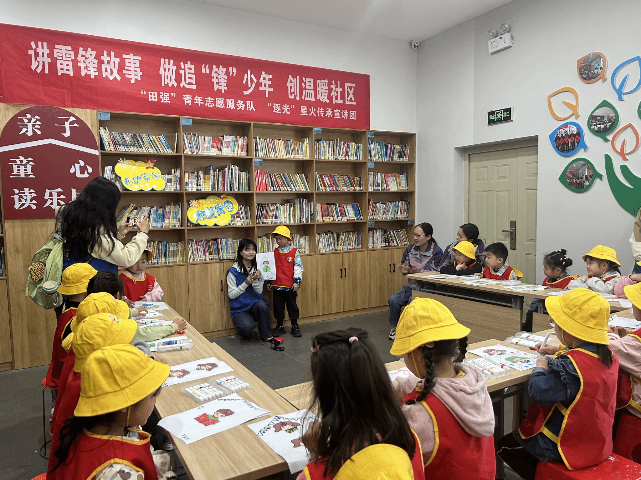 在 “我心中的雷锋叔叔” 绘画环节,孩子们用五彩画笔描绘出自己理解的雷锋精神。有的画出手拿工具箱的雷锋,有的画出搀扶老人的场景,还有孩子用太阳、桃心象征雷锋带来的温暖。志愿者们俯身指导,鼓励孩子们为画作添加创意元素,并引导他们分享创作思路。“雷锋叔叔像超人,哪里需要帮助就出现在哪里!” 一名小朋友举着画作大声说道,引得现场掌声阵阵。