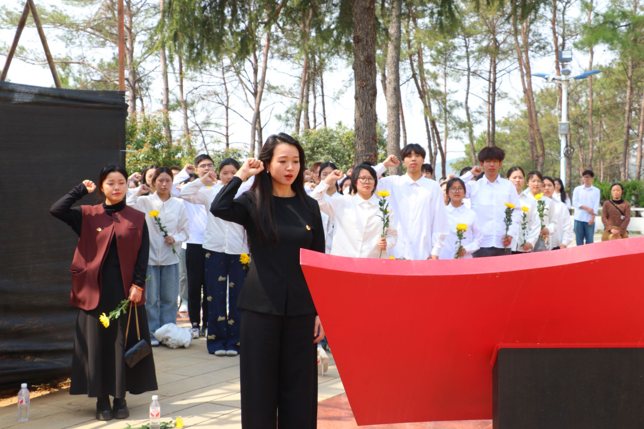 在纪念碑下,夏婷带领全体师生重温入党誓词。铿锵有力的誓言在陵园上空回荡,表达着对党忠诚、为共产主义奋斗终生的坚定信念。这不仅是一场精神的洗礼,更是一次初心的叩问。这份誓言,不仅是对革命先烈的承诺,更是对新时代使命的担当。同学们也纷纷表示,如今的和平生活是先烈们用生命换来的,作为新时代青年,要将个人理想融入国家发展,在学习和社会实践中勇担时代使命。