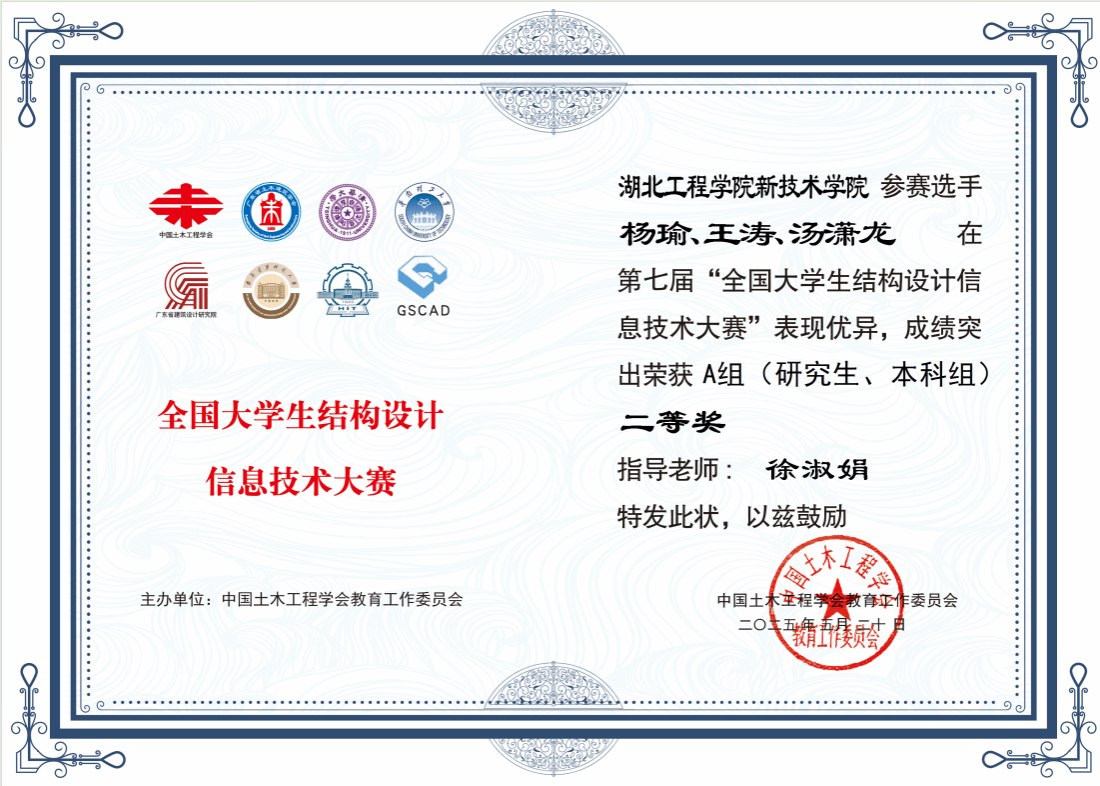 第七届全国大学生结构信息技术大赛中,Beat365城市建设系由杨子江、姚大飞、徐淑娟3位老师指导的27名学生组成9支队伍参赛,经过三个多月的备赛与角逐,有7支队伍脱颖而出,共斩获7项奖项,其中由徐淑娟老师指导,王天乐、李芸蕾、邹长喜团队获A组一等奖。