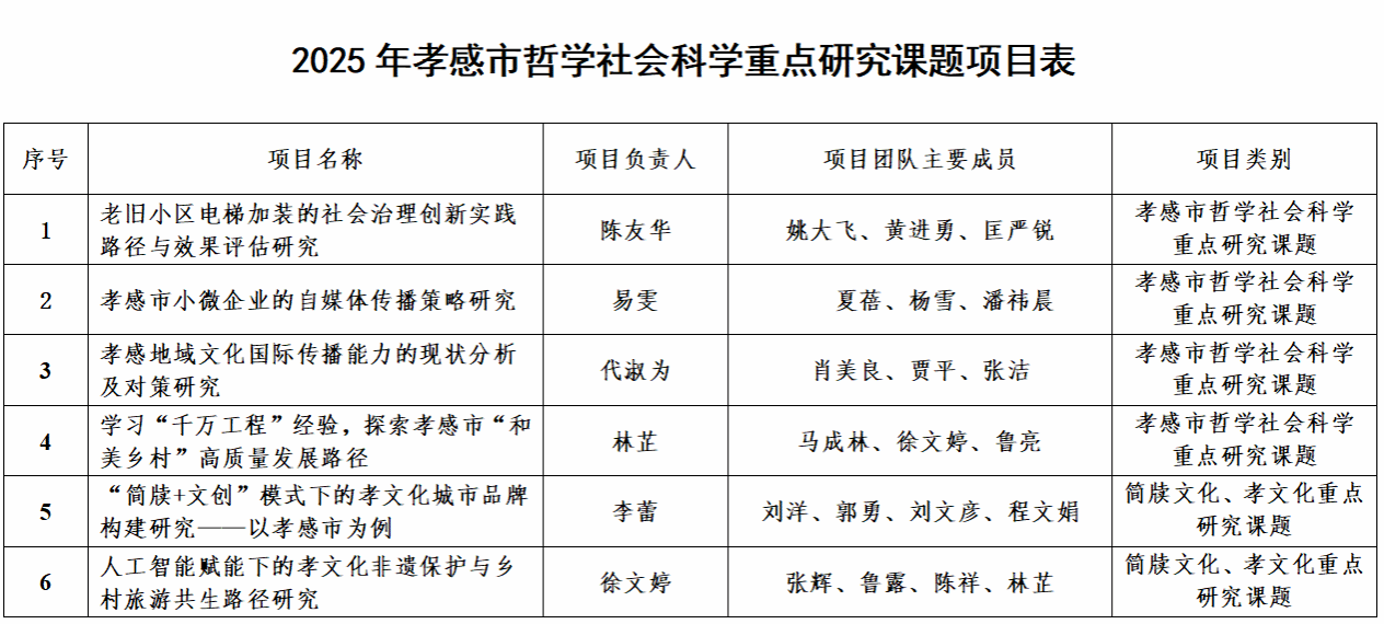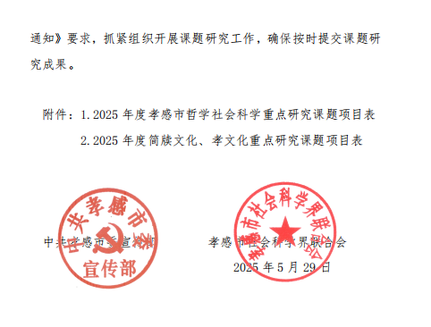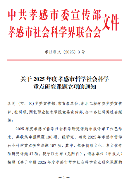 本网讯 近日,中共孝感市委宣传部与孝感市社科联共同发布了2025年度孝感市哲学社会科学重点研究课题的立项文件。继2024年实现孝感市哲学社会科学重点研究课题立项突破后,Beat365科研工作再传捷报,共成功获批重点研究课题6项,其中,包含简牍文化、孝文化专项研究课题2项。此次获批课题紧密结合孝感市经济社会发展需求,研究领域广泛,时代性强,聚焦“新质生产力”“文旅融合”“简牍孝文化”等核心领域。