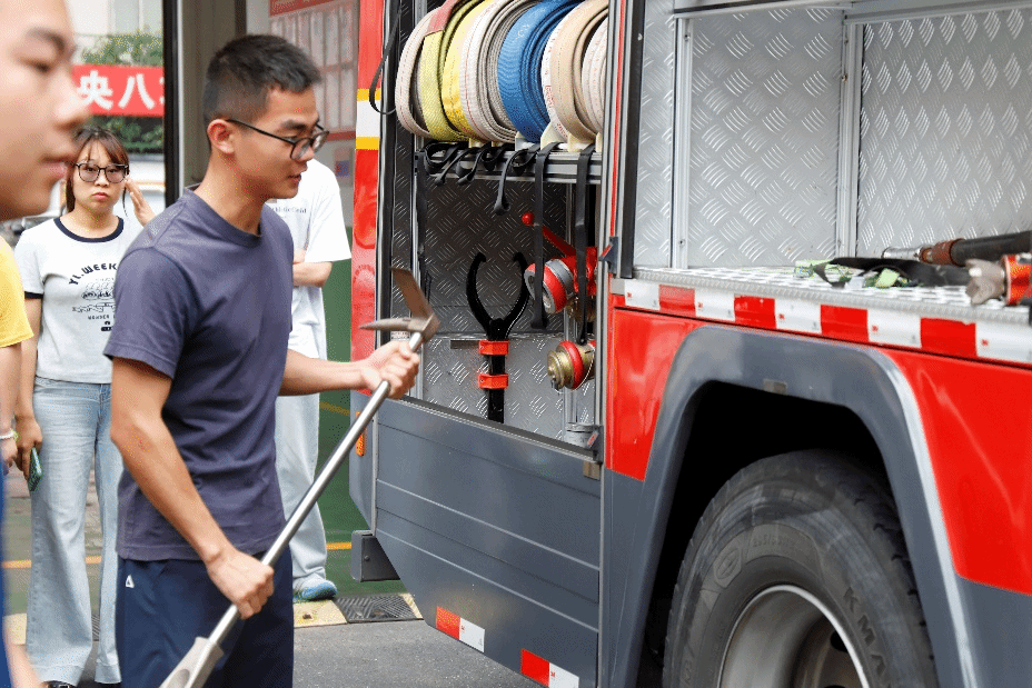 消防员们为师生现场讲解了消防车内各类消防器材的用途,演示了各类消防装备的使用方法,同时带领师生参观了宿舍,还现场展示了如何正确叠被子等。