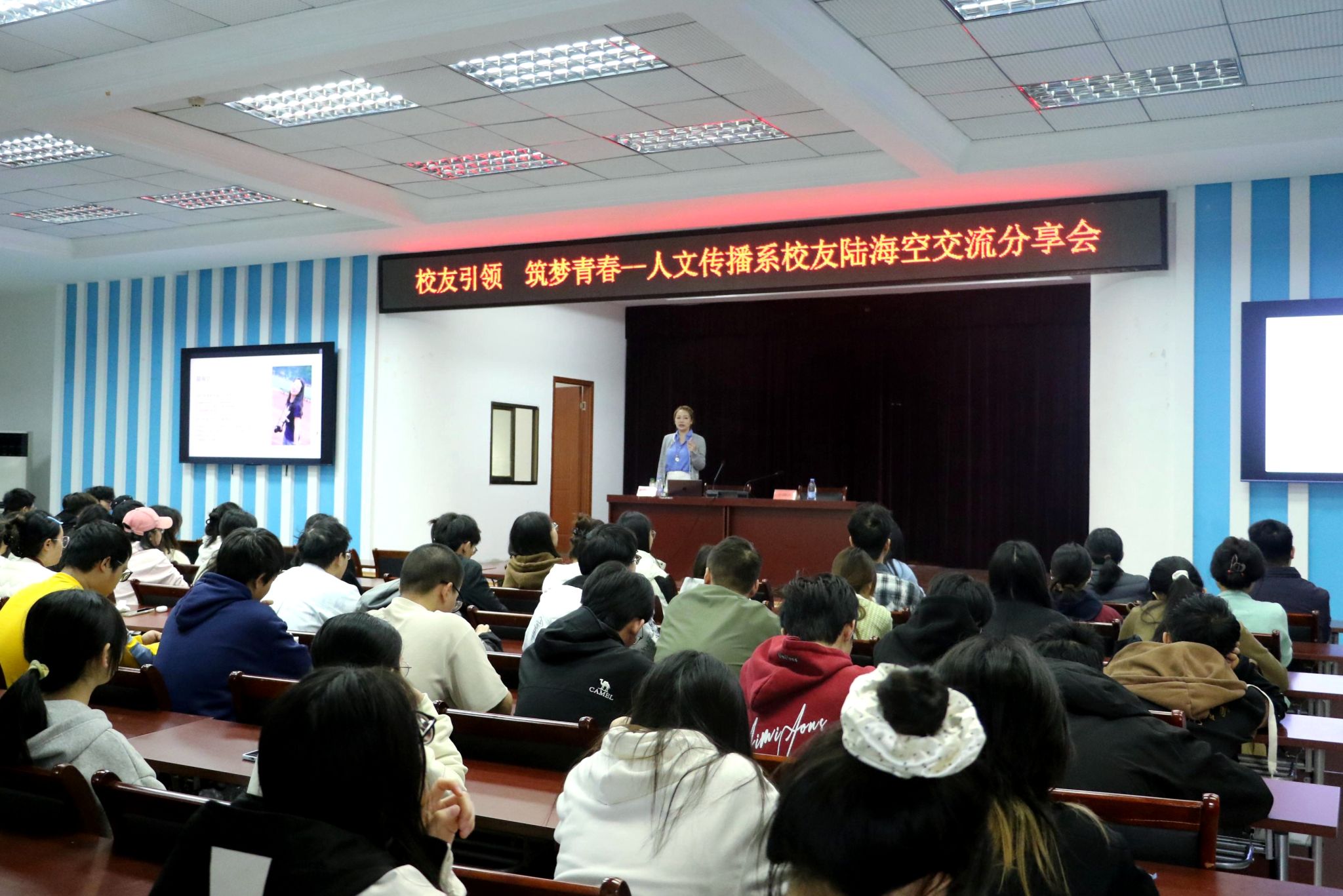 本网讯 为凝聚校友资源、搭建成长阶梯,切实帮助在校学子厘清专业发展路径、明晰职业规划方向、深化行业认知,11月15日,人文传播系在科技楼报告厅成功举办优秀校友职业规划分享会。广告学、网络与新媒体专业的师生代表齐聚一堂,共同聆听优秀校友带来的成长经验。