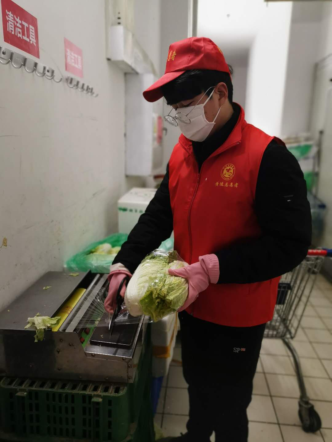 面对武汉市严峻的疫情防控形势,詹学林作为一名武汉人,作为一个大学生,在看到武汉市在网络上发布的征集公告之后,选择了做一名志愿者。2月9日起,他在超市进行蔬菜分拣工作,每天一早,他会戴上口罩早早到超市测体温、洗手、戴手套,做好蔬菜分拣前的一切准备工作后,和其他的志愿者们一起分工合作,将全国各地驰援武汉的一箱箱蔬菜再分装塑料袋中打包好,摆放在柜架上。“每次分拣都更意识到全国人民都在帮助我们,只有感动,没有辛苦!”