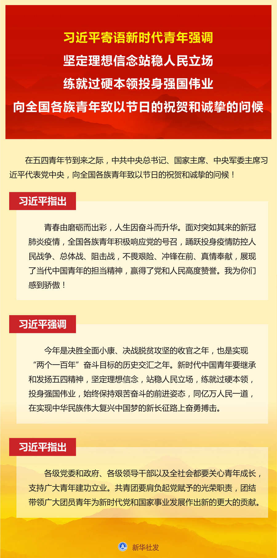 新华社北京5月3日电 在五四青年节到来之际,中共中央总书记、国家主席、中央军委主席习近平代表党中央,向全国各族青年致以节日的祝贺和诚挚的问候!