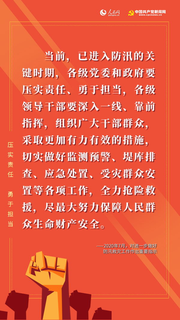 近日,习近平总书记在对进一步做好防汛救灾工作作出重要指示时强调,各级党委和政府要压实责任、勇于担当,各级领导干部要深入一线、靠前指挥。