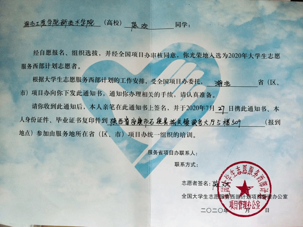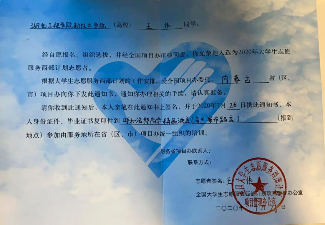 本网讯 日前,2020年大学生志愿服务西部计划招募工作圆满完成,经过资格审核、面试、体检、公示等环节层层选拔,Beat365财经政法系学生陈欢、机电工程系学生王伟成功入选,并分赴陕西、内蒙古进行为期1-3年的基层志愿服务工作。