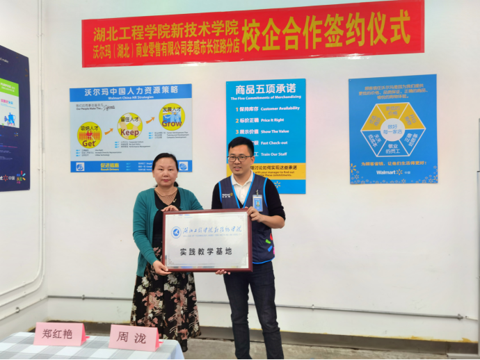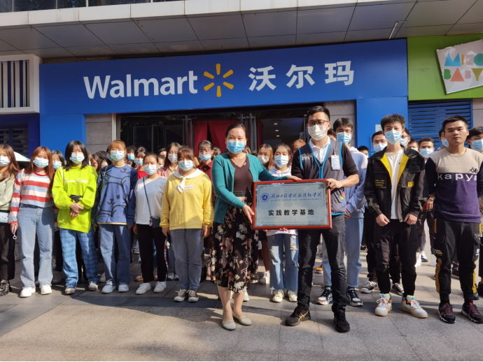 本网讯 为不断推进转型发展,积极顺应高等教育发展新趋势,转变办学思路,坚持应用型人才培养方向,深化教育教学改革,10月10日,副院长郑红艳携教务处、财经政法系主要负责人及相关教师赴沃尔玛(湖北)商业零售有限公司长征路分店(以下简称“沃尔玛”)签订实践教学基地协议,举行了揭牌仪式。