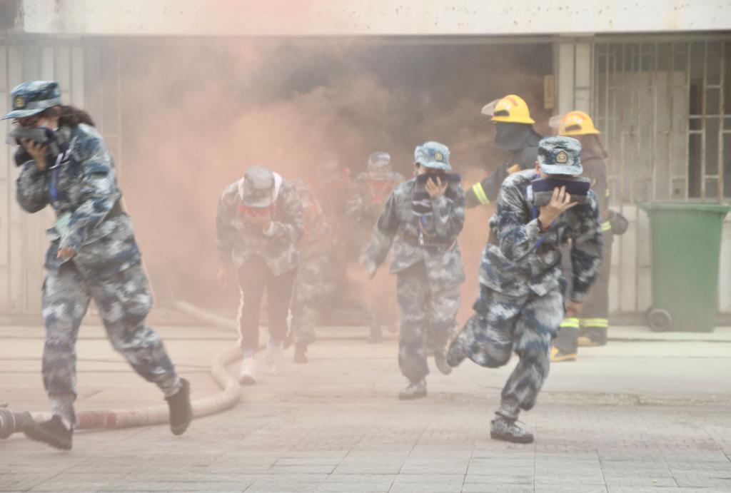 为了让同学们更为直观地感受火场,迅速掌握逃生技能,消防官兵现场点燃液化石油气罐。火势强烈后,消防官兵安排了多名学生学习使用干冰灭火器灭火。霎时空中浓烟滚滚,刺激的气味扑鼻而来。新生们捂住口鼻,弯腰低身,迅速有序地由逃生通道逃离到指定的安全之地。