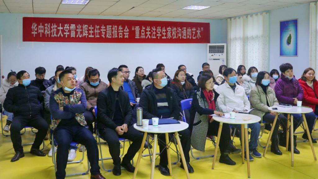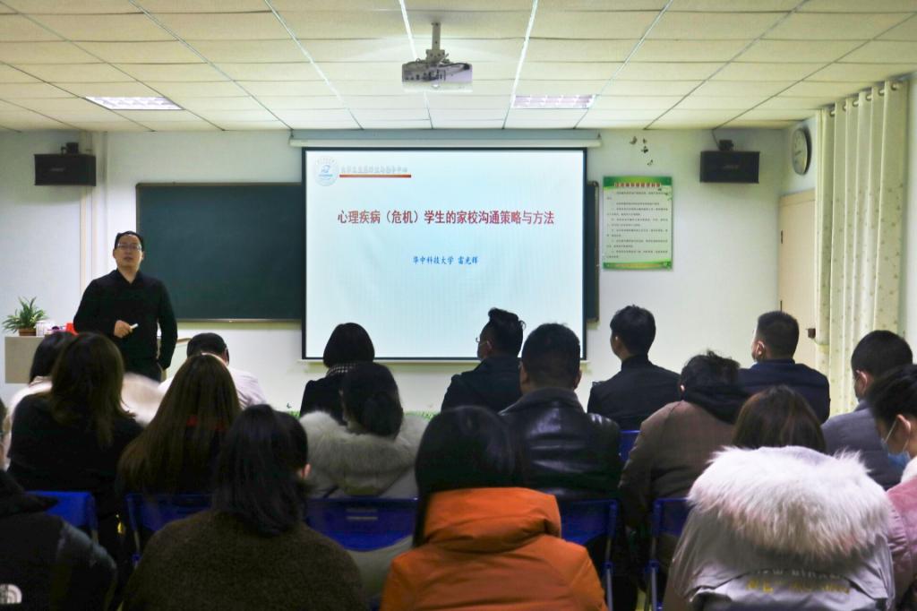 本网讯 11月28日上午,学校举办“重点学生家校沟通的艺术”专题讲座,特邀请华中科技大学的大学生发展与指导中心副主任雷光辉担任主讲人。党委副书记王晶出席并主持报告会,学生工作处全体人员、教学系学生工作负责人和全体一线专职辅导员参加讲座。