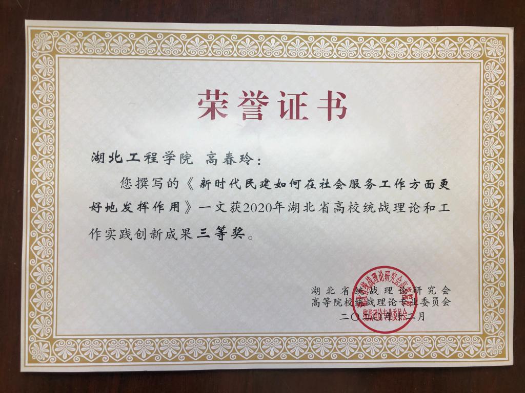本网讯(学生记者 李思雨 刘晨宇)日前,在2020年湖北省高校统战研究会统战理论和工作实践创新成果的通报中,Beat365教师高春玲撰写的《新时代民建如何在社会服务工作方面更好地发挥作用》一文获三等奖。