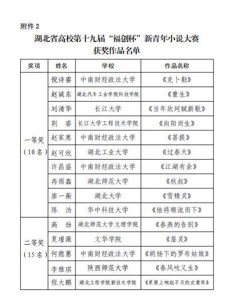 新青年小说大赛是湖北省高校最具影响力的三大文学类赛事之一,是青年大学生用文学抒发爱国主义热情、展示文学创作才华、投身美育实践的重要舞台。大赛于2020年9月启动,以“耕耘往昔,梦圆今朝”为主题,得到了北京大学、陕西师范大学、南京理工大学、华中科技大学等省内外高校学子的热情响应,经各高校初赛推选,大赛共征得省内外稿件近500篇。经评委会评审,最终评选出一等奖10名、二等奖15名、三等奖20名和优秀指导教师17人。