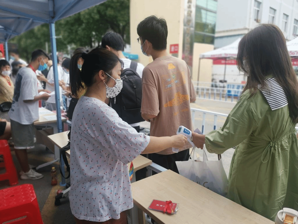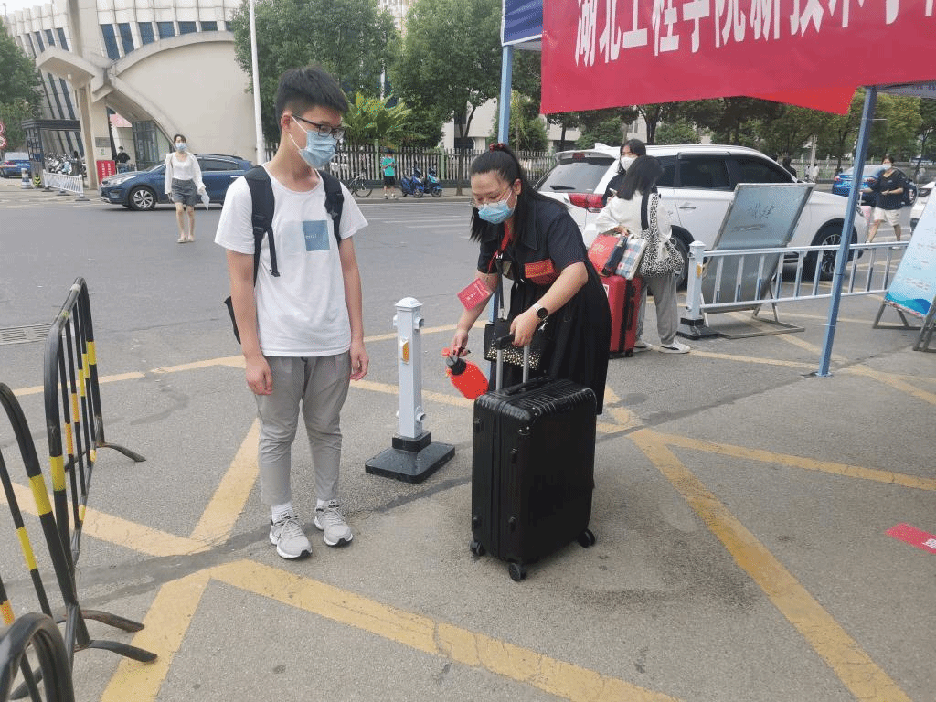 “同学,请配合测量一下体温,是哪个学院的呀?行李箱给我,过来消一下毒……”