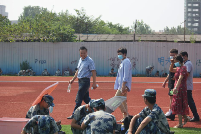 在工作人员的带领下来到军训训练场看望新生