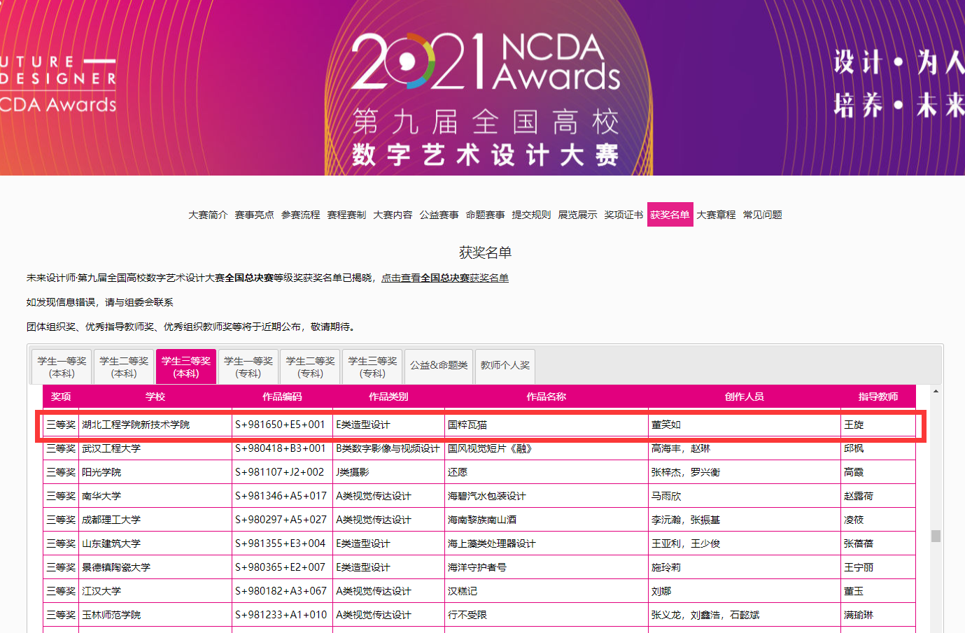 本网讯(通讯员王海栎)日前,第九届全国高校数字艺术设计大赛(未来设计师NCDA大赛)评审结果出炉。Beat365董笑如同学的作品《国粹瓦猫》(指导老师:王旋)荣获全国三等奖;同时还有许沙沙等同学在我系教师指导下取得湖北省一等奖两项、二等奖五项、三等奖三项的好成绩。