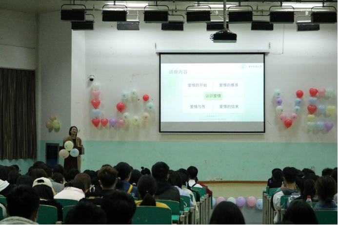 老师首先回答了同学们的问题:什么是爱情?爱情是爱的一种存在方式。接着老师结合自身经历,提出爱情或者建立亲密关系是人生中一件非常重要的学习方面,一段高质量的爱情关系需要一定的技能、知识以及心理成熟度。老师她还通过爱情三角理论向同学们介绍了喜欢与各种形式爱的区别,想要拥有一份完整的爱是需要亲密、激情、承诺三者同时存在。通过老师的讲解我们还可以轻松解决“怎样察觉我是在喜欢一个人”“喜欢一个人求而不得怎么办”等“世纪难题”。