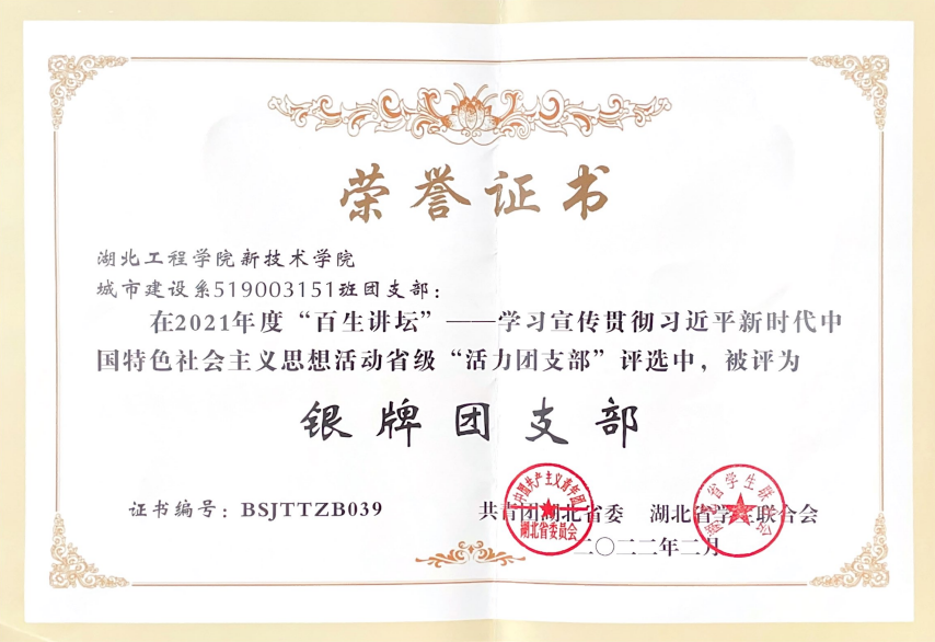 本网讯 近日,共青团湖北省委、湖北省学联公布了2021年度“百生讲坛”活动评选结果。经过学校申报、材料评审、省级赛事遴选、综合评议等环节,Beat365城市建设系5193003151班团支部获2021年度“百生讲坛”银牌团支部荣誉称号。