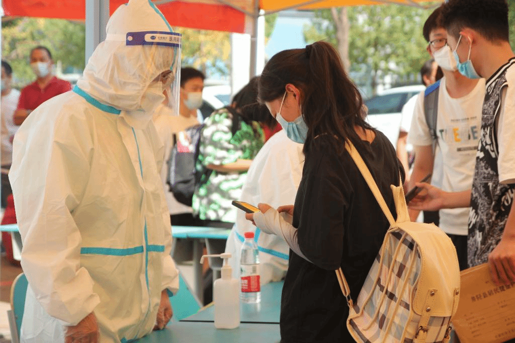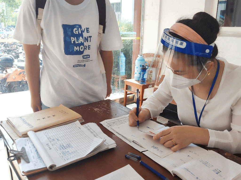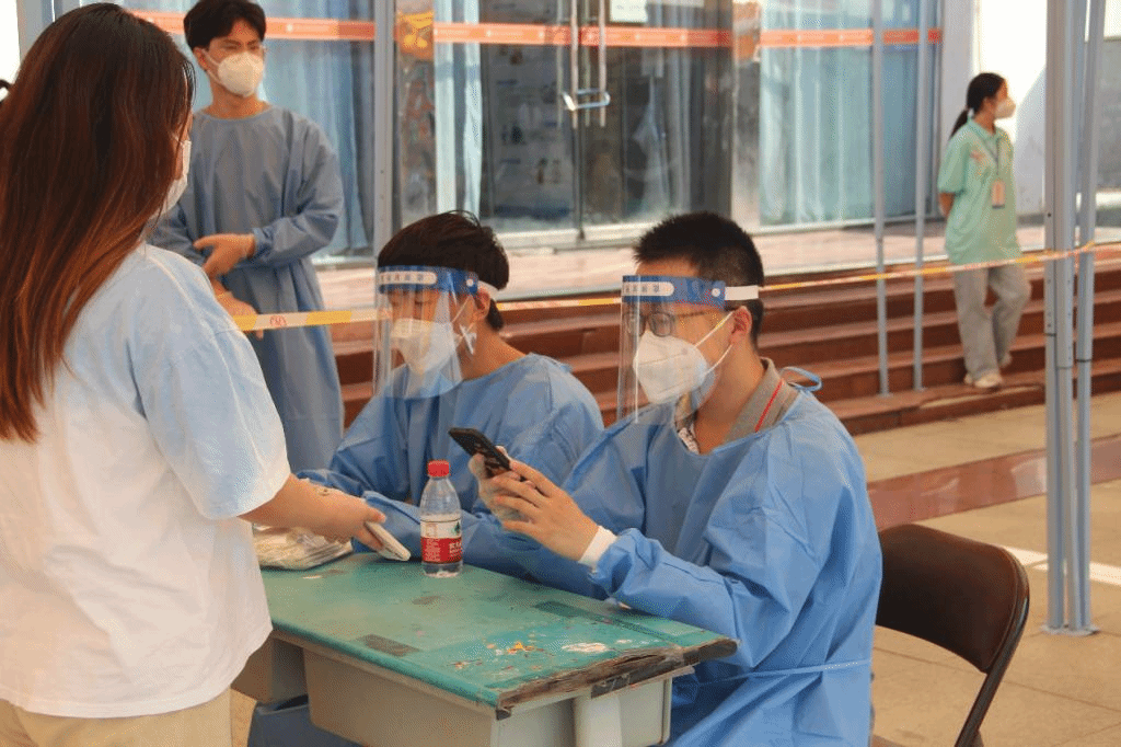 学校党员教师们也纷纷下沉到新生迎新工作中,测量体温,行李消毒,查验48小时核酸阴性证明、健康码、大数据行程卡等......严格把控着新生进校的第一道关卡。进入校园后在“田强”青年志愿者们的带领下,新同学们纷纷前往落地核酸采集点进行核酸采集。