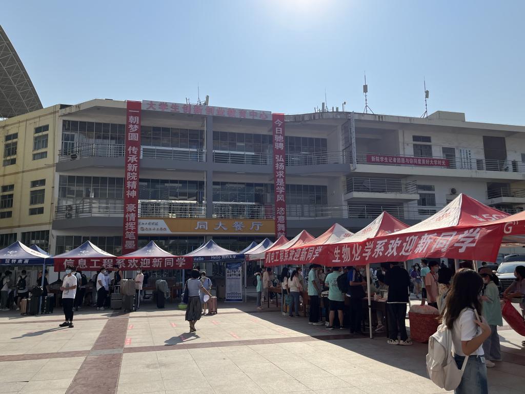 满载新生的大巴一辆接一辆地停在学校门口。搬行李、指路……,早早准备就绪的志愿者们热情地提供帮助,带着新生们进入期盼已久的大学校园。