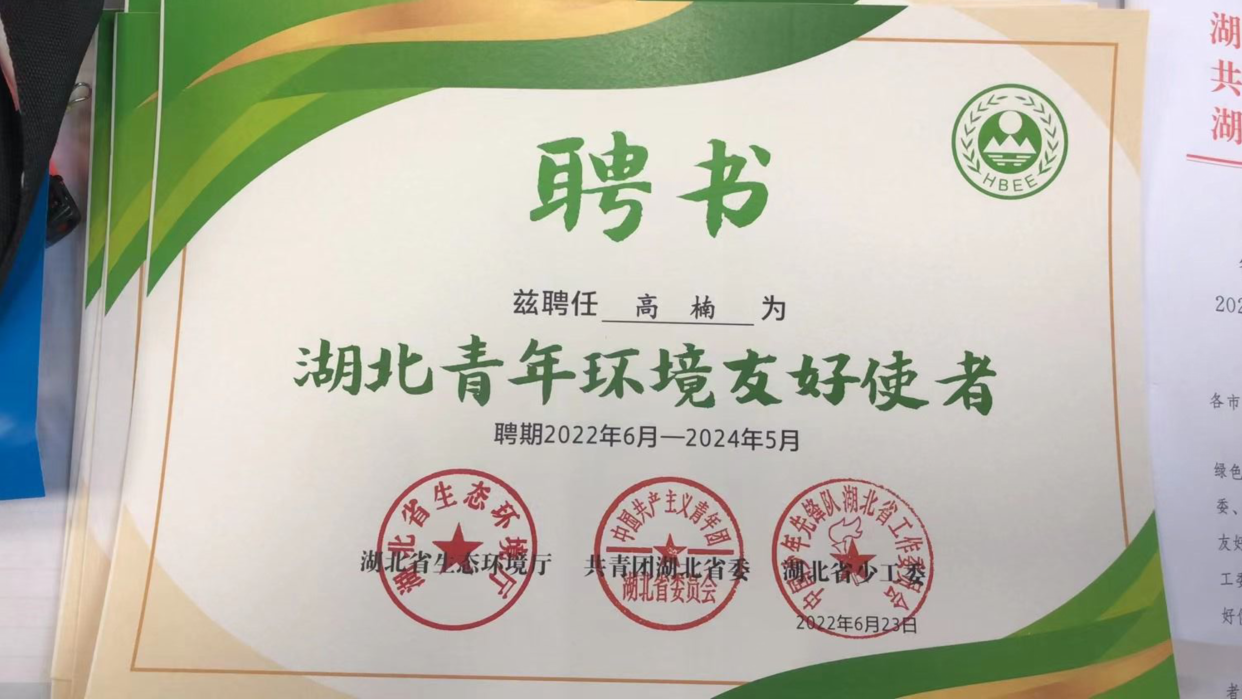 “青年环境友好使者推选活动”是由湖北省生态环境厅、共青团湖北省委、湖北省少工委等单位共同发起,旨在深入学习宣传贯彻习近平生态文明思想,践行绿色生活,积极参与生态文明实践,影响和动员更多社会公众做美丽中国的倡导者和建设者,共同营造生态环境共建共治共享的社会氛围。