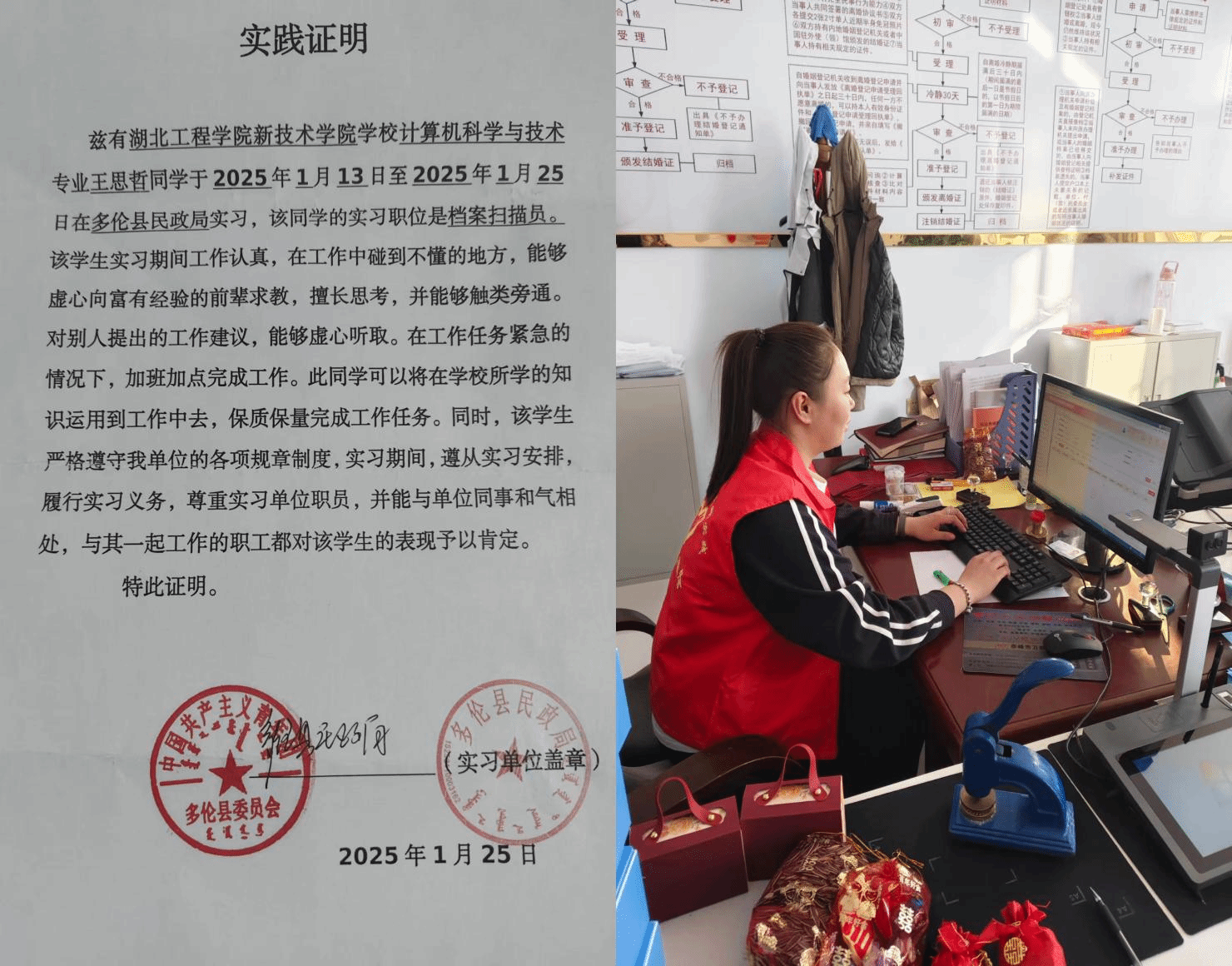 为培养青年学子社会责任感、增强责任担当意识,信息工程系积极开展寒假大学生“返家乡”社会实践活动。2024级计算机科学与技术专业学生王思哲在家乡内蒙古自治区多伦县民政局参与实践活动,投身基层社会服务,贡献自己的力量;2024级数据科学与大数据技术专业学生黄烨在家乡福州市台江区报名参与社区志愿服务活动,他耐心细致地向当地居民宣传网络诈骗相关知识,有效提升了居民的反诈防骗意识。