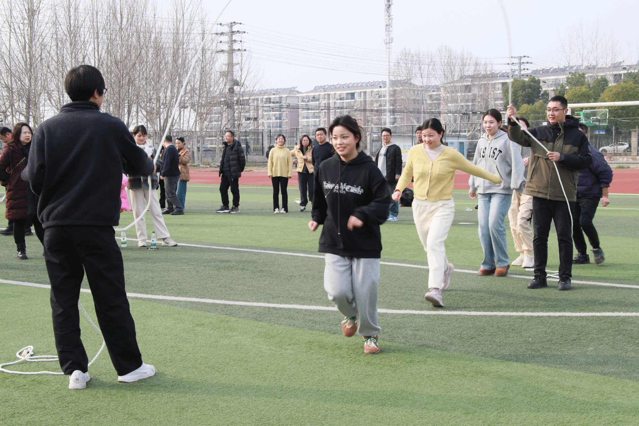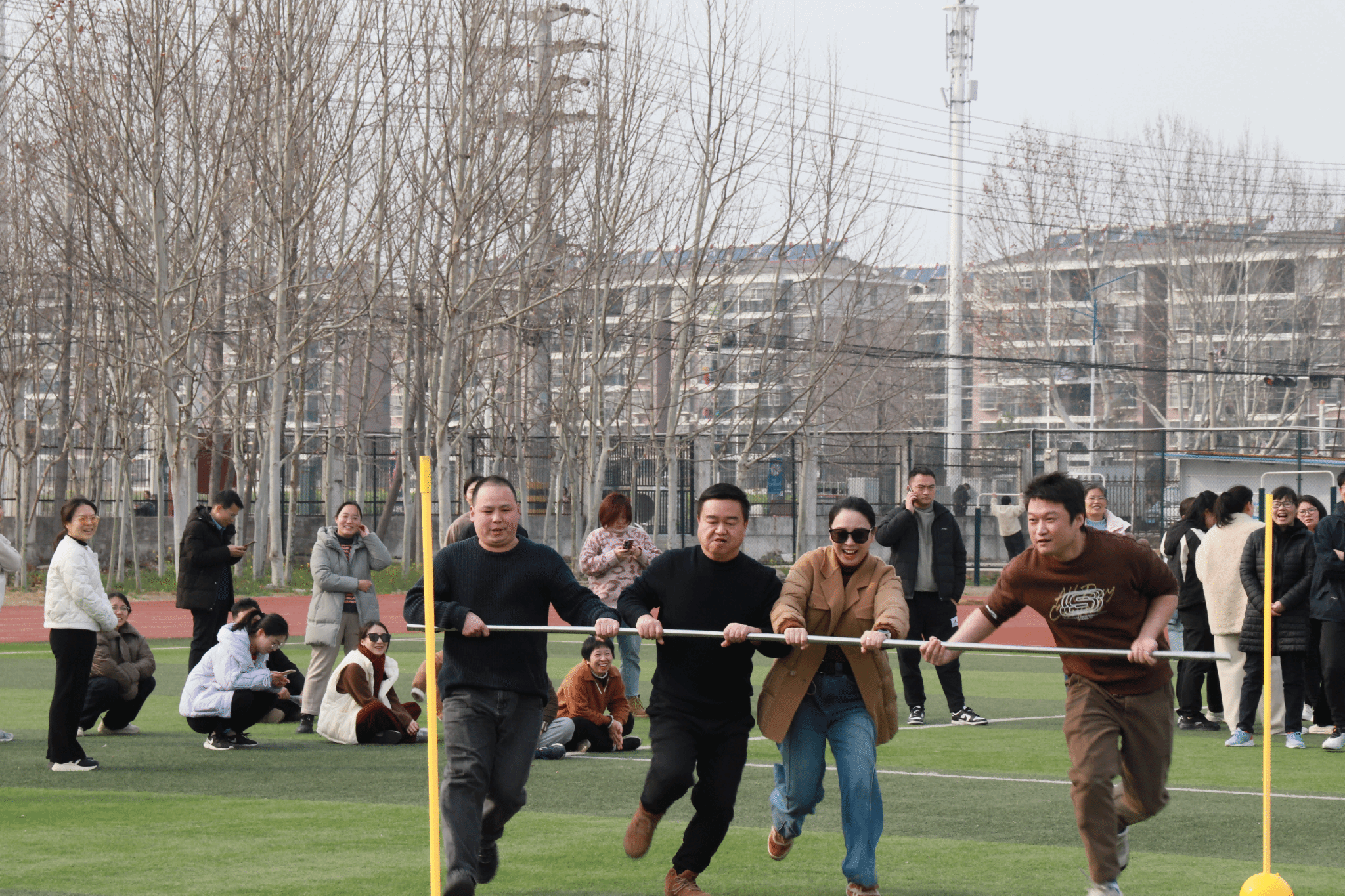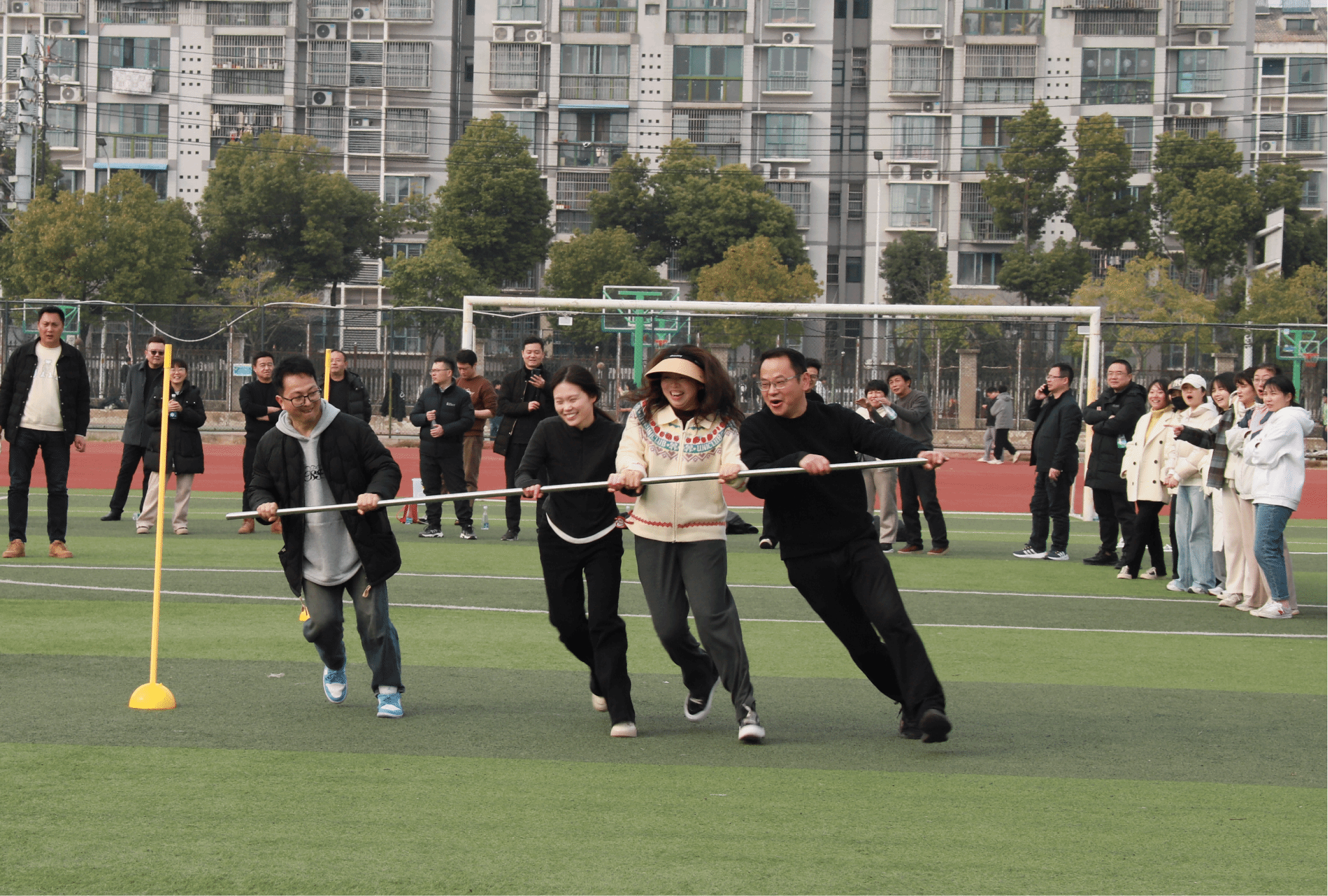 旋风跑比赛中,每队四名教职工紧握长杆,围绕标志杆呈“S”形快速穿梭。小组成员间配合默契,步伐整齐划一,充分彰显出强大的向心力与团队精神。“8”字跳绳时,长绳飞速旋转,老师们轻盈地依次跃入,动作流畅、节奏明快。最终,运动会在一片欢声笑语中圆满落下帷幕。